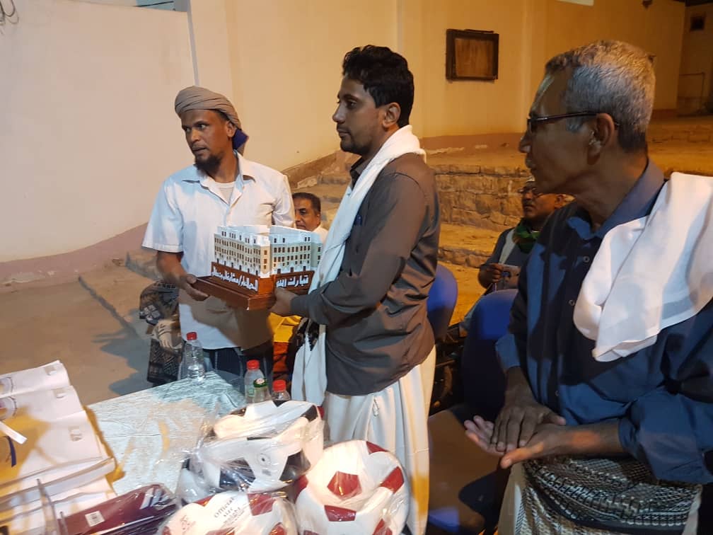 حيث جرى تسليم الهدية خلال وقائع المسابقة العلمية الثقافية السنوية التي نظمها منتدى شبام مساء اليوم الثلاثاء 20/ أبريل/ 2021 م بمشاركة 5 فرق رياضية فاز فيها بكأس البطولة مجمع الأحقاف الرياضي الثقافي الاجتماعي بشبام والتي أقيمت بساحة مدرسة الحبيب العلامه السيد / عبد الله بن مصطفى بن سميط بمدينة شبام .