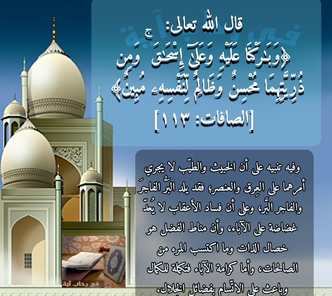 ﴿وَبَٰرَكْنَا عَلَيْهِ وَعَلَىٰٓ إِسْحَٰقَ ۚ وَمِن ذُرِّيَّتِهِمَا مُحْسِنٌ وَظَالِمٌ لِّنَفْسِهِۦ مُبِينٌ﴾