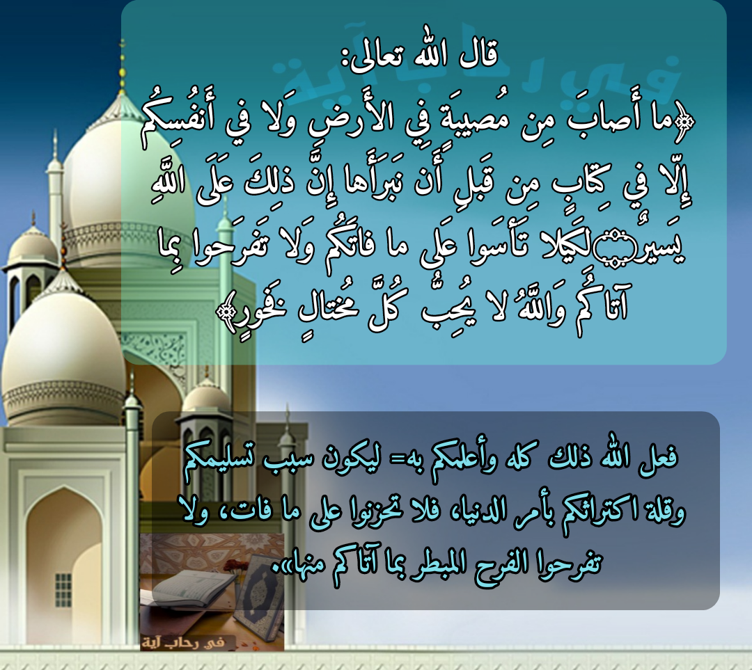 ﴿ما أَصابَ مِن مُصيبَةٍ فِي الأَرضِ وَلا في أَنفُسِكُم إِلّا في كِتابٍ مِن قَبلِ أَن نَبرَأَها إِنَّ ذلِكَ عَلَى اللَّهِ يَسيرٌلِكَيلا تَأسَوا عَلى ما فاتَكُم وَلا تَفرَحوا بِما آتاكُم وَاللَّهُ لا يُحِبُّ كُلَّ مُختالٍ فَخورٍ﴾