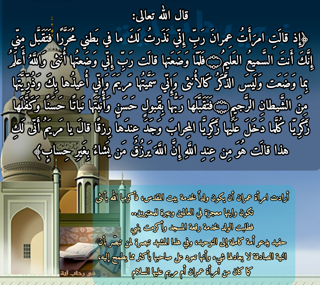 ﴿إِذ قالَتِ امرَأَتُ عِمرانَ رَبِّ إِنّي نَذَرتُ لَكَ ما في بَطني مُحَرَّرًا فَتَقَبَّل مِنّي إِنَّكَ أَنتَ السَّميعُ العَليمُفَلَمّا وَضَعَتها قالَت رَبِّ إِنّي وَضَعتُها أُنثى وَاللَّهُ أَعلَمُ بِما وَضَعَت وَلَيسَ الذَّكَرُ كَالأُنثى وَإِنّي سَمَّيتُها مَريَمَ وَإِنّي أُعيذُها بِكَ وَذُرِّيَّتَها مِنَ الشَّيطانِ الرَّجيمِفَتَقَبَّلَها رَبُّها بِقَبولٍ حَسَنٍ وَأَنبَتَها نَباتًا حَسَنًا وَكَفَّلَها زَكَرِيّا كُلَّما دَخَلَ عَلَيها زَكَرِيَّا المِحرابَ وَجَدَ عِندَها رِزقًا قالَ يا مَريَمُ أَنّى لَكِ هذا قالَت هُوَ مِن عِندِ اللَّهِ إِنَّ اللَّهَ يَرزُقُ مَن يَشاءُ بِغَيرِ حِسابٍ﴾