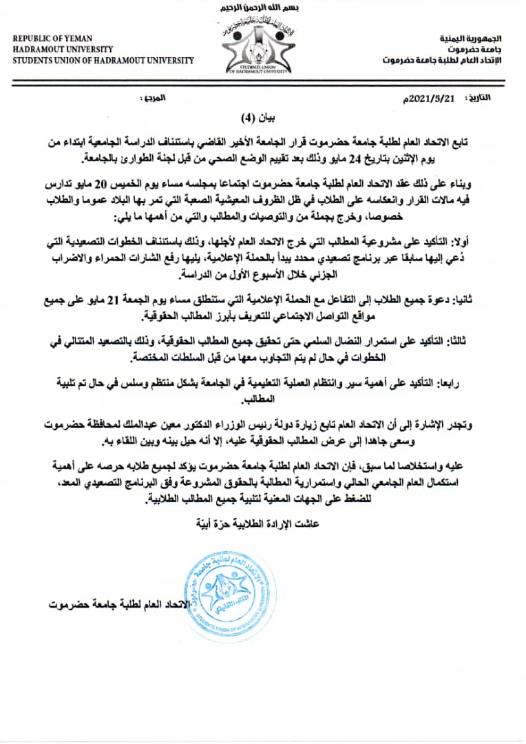 وسيصدر بيان عن الإتحاد لاحقاً، يوضح فيه البرنامج التصعيدي والخطوات المزمنة التي سيقدم عليها الإتحاد، في إطار مساعية لتخفيف من أعباء الظروف المعيشية على الطلبة.