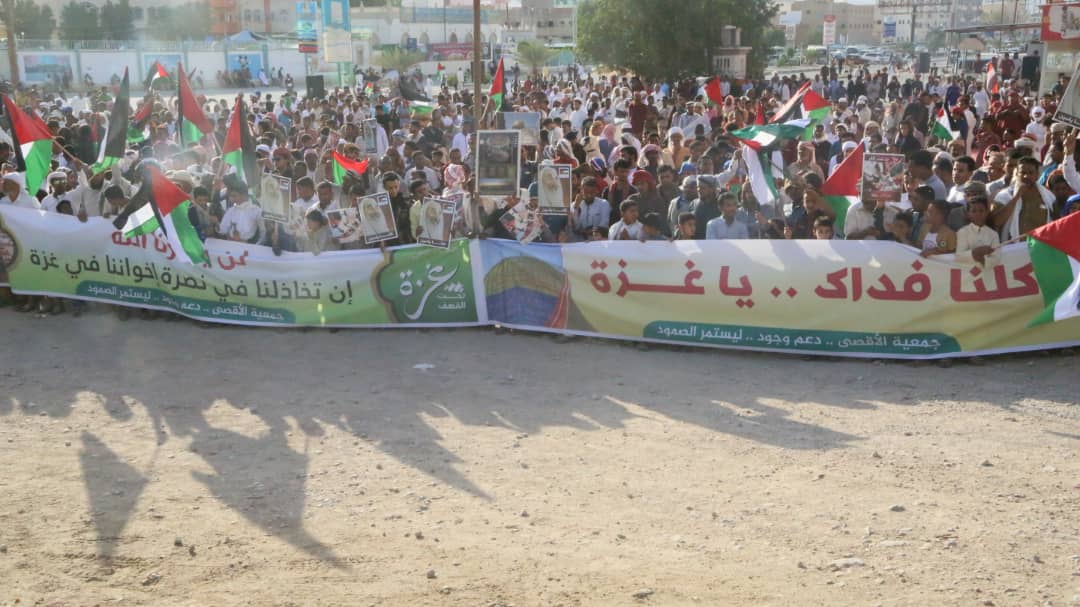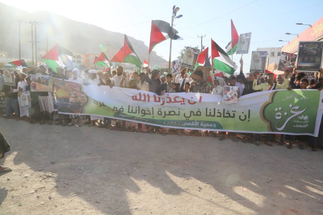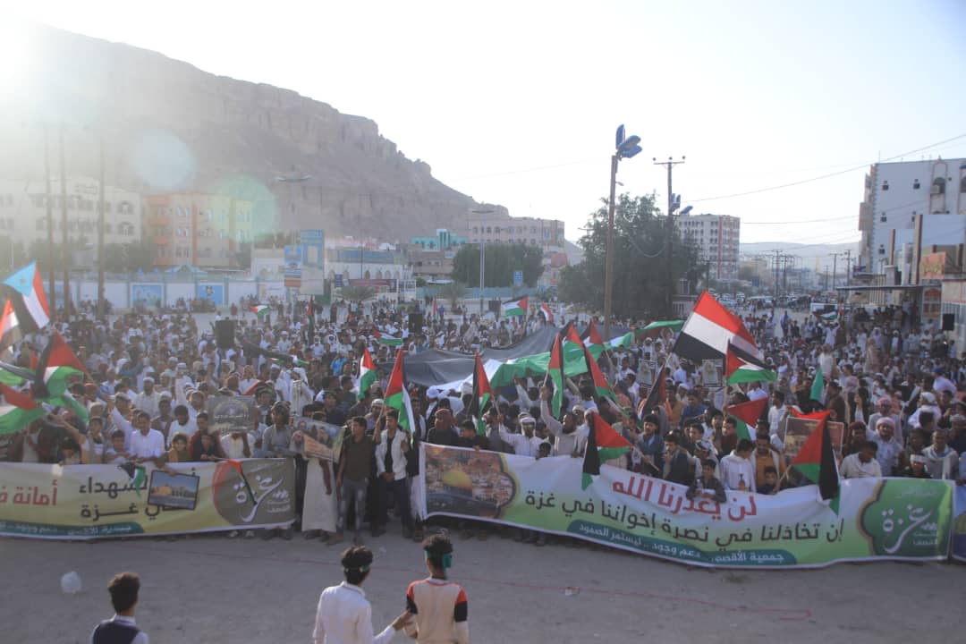 مضيفا ” علمونا ابناء فلسطين كيف يكون الجهاد والصمود والتوحد وعدم الاختلاف تجاه القضايا الكبرى للمسلمين ” . منوها الى الجموع التي احتشدت اليوم بسيئون تجتمع اليوم لتوصل رسالتها الى العالم اجمع ان فلسطين ستبقى القضية الأولى للمسلمين .