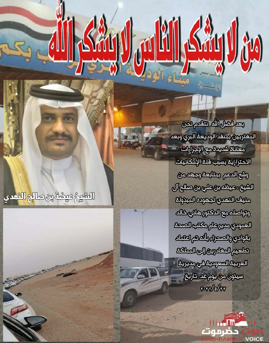بعد فضل الله نتقدم نحن المغتربين بمنفذ الوديعة البري وبعد معاناة شديدة مع الإجراءات الاحترازية بسبب قلة الإمكانيات وشح الدعم بمتابعة وجهد من الشيخ : عيظه بن علي بن صالح آل منيف النهدي لجهوده المبذولة وتواصله مع الدكتور هاني خالد العمودي مدير عام مكتب الصحة بالوادي والصحراء بأنه تم اعتماد تطعيم المغادرين إلى المملكة العربية السعودية في مديرية سيئون من يوم غد تاريخ 2021/5/22 م