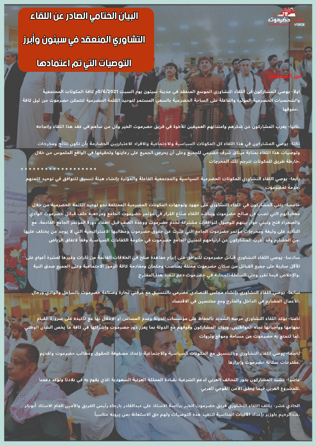 اولاً- يوصي المشاركون في اللقاء التشاوري الموسع المنعقد في مدينة سيئون يوم السبت 5/6/2021م كافة المكونات المجتمعية والشخصيات الحضرمية المؤثرة والفاعلة على الساحة الحضرمية بالسعي المستمر لتوحيد الكلمة الحضرمية لتتمكن حضرموت من نيل كافة حقوقها.