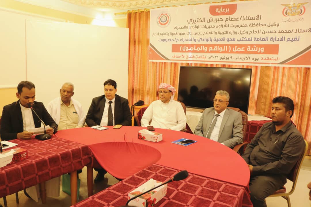 بمدينة سيؤن ورشة العمل للإدارة العامة لمحو الأمية وتعليم الكبار ، تحت عنوان (الواقع والمأمول) وتاتي هذه الورشة لتقييم الايجابيات والسلبيات ، وبتنظيم وإشراف الإدارة العامة ، وبرعاية وكيل محافظة حضرموت الأستاذ عصام حبريش الكثيري ، ورئيس جهاز محو الأمية وتعليم الكبار الاستاذ/ محمد حسين الحاج.