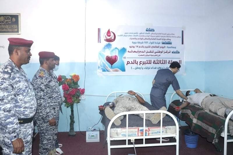 دشّن المركز الوطني لنقل الدم وأبحاثه بوادي وصحراء حضرموت صباح يوم السبت الحملة الثالثة للتبرع بالدم تحت شعار ( دمي فداء ترابك يا وطن ) بقيادة اللواء 101 شرطة جوية بسيئون تزامنا باليوم العالمي للتبرع بالدم الذي يصادف 14 يونيو من كل عام برعاية كريمة من معالي وزير الصحة العامة والسكان الاستاذ الدكتور / قاسم محمد بحيبح ووكيل محافظة حضرموت لشئون مديريات الوادي والصحراء / عصام حبريش الكثيري ومدير عام مكتب وزارة الصحة العامة والسكان بالوادي والصحراء الدكتور / هاني خالد العمودي، بإقامة محاضرة توعوية وحملة التبرع بالدم .