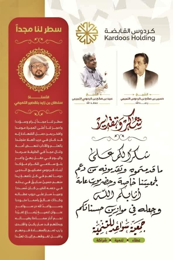 شكرا للرئيس الفخري لجمعية سواعد عبدالعزيز عوض التميمي