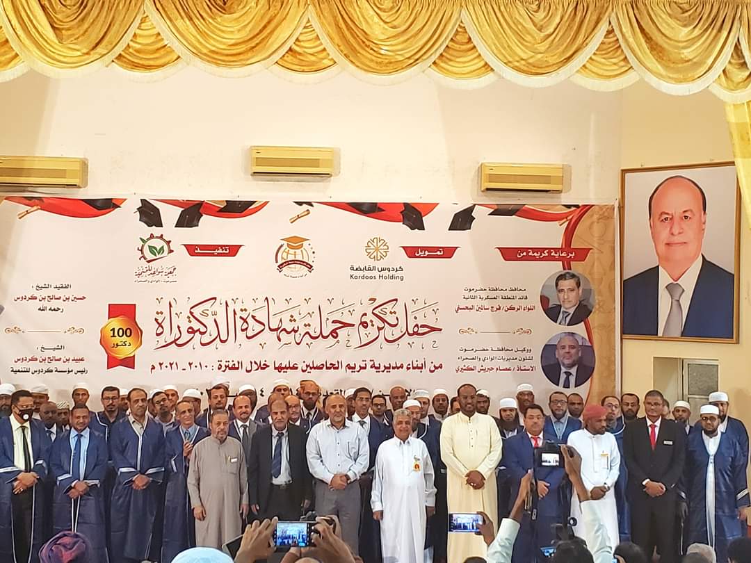 حفل تكريم لحملة شهادة الدكتوراة من أبناء مديرية تريم للحاصلين عليها خلال الفترة (2010 ــ2021) بتمويل من مؤسسة كردوس القابضة وتنفيذ جمعية سواعد للتنمية
