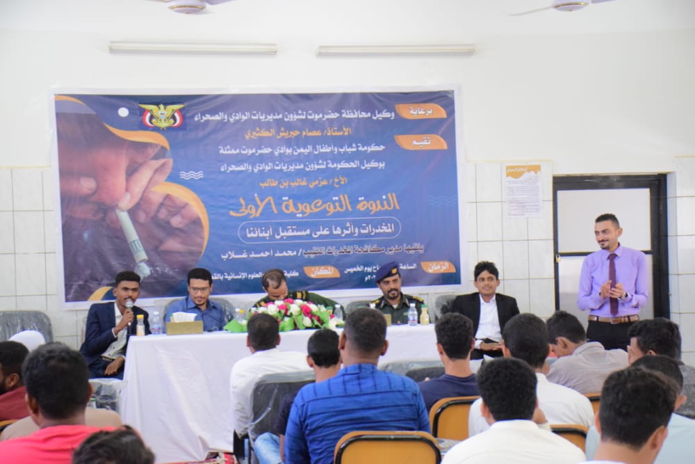 وكيل وادي حضرموت بحكومة شباب وأطفال اليمن يقيم ندوة توعوية بكلية الحقوق والعلوم الإنسانية بالقطن تحت عنوان المخدرات وأثرها على مستقبل أبنائنا .