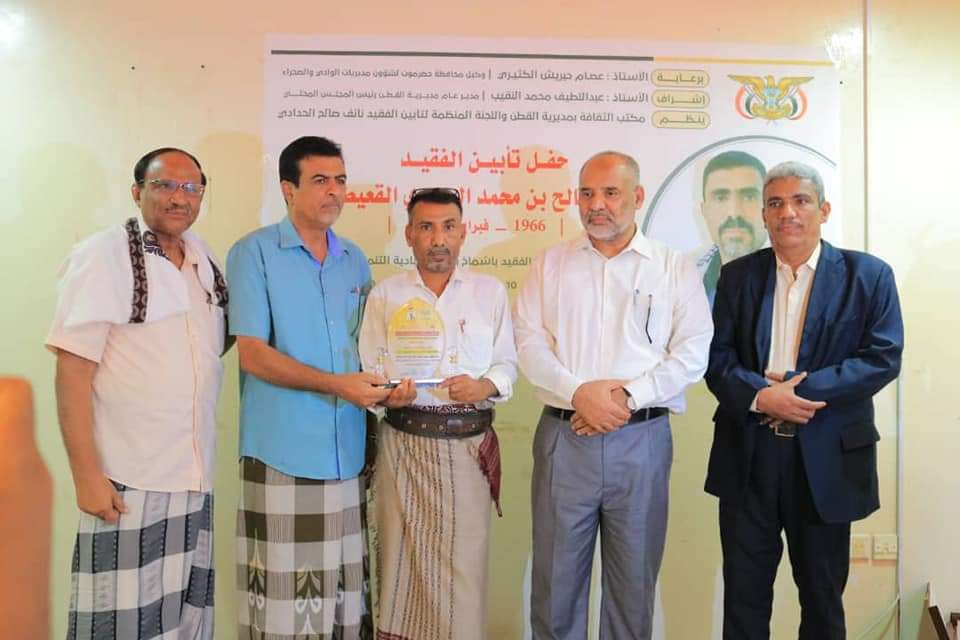 نظمت إدارة الثقافة بمديرية القطن بحضرموت ، اليوم، فعالية تأبينية لمديرها السابق الشاعر والباحث نائف صالح الحدادي القعيطي ، بإشراف السلطة المحلية بالمديرية ومكتب وزارة الثقافة بوادي حضرموت والصحراء.
