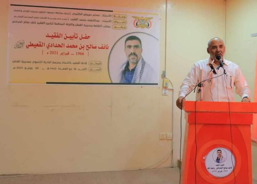 نظمت إدارة الثقافة بمديرية القطن بحضرموت ، اليوم، فعالية تأبينية لمديرها السابق الشاعر والباحث نائف صالح الحدادي القعيطي ، بإشراف السلطة المحلية بالمديرية ومكتب وزارة الثقافة بوادي حضرموت والصحراء.