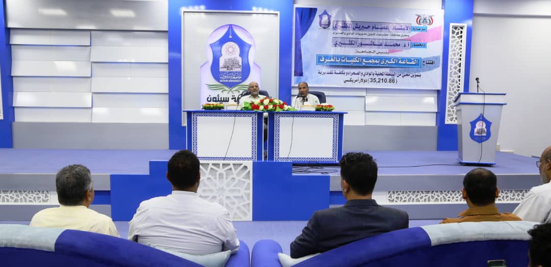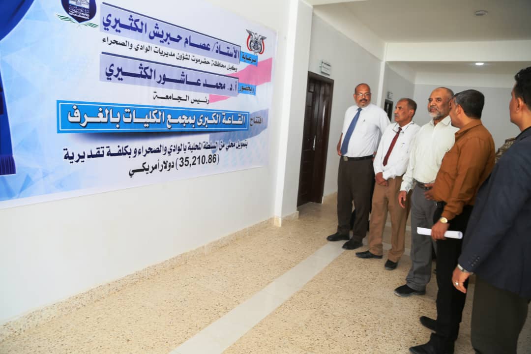 افتتح وكيل محافظة حضرموت لشؤون مديريات الوادي والصحراء عصام حبريش الكثيري ومعه رئيس جامعة سيئون البروفيسور محمد عاشور الكثيري اليوم القاعة الكبرى والمختبر العلمي للنباتات والأحياء الدقيقة بمجمع كليات جامعة سيئون بمنطقة الغرف بكلفة إجمالية بلغت 51 الف و 100 دولار بتمويل محلي من السلطة المحلية بالوادي والصحراء .