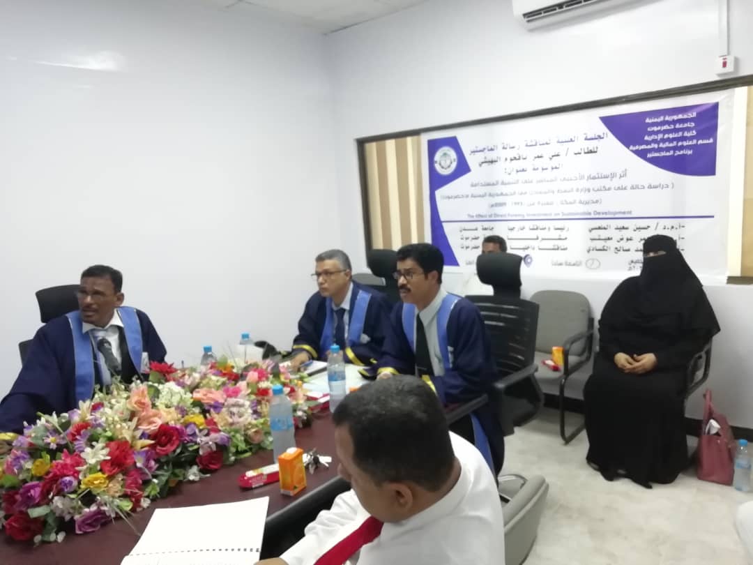احتضنت القاعة الألكترونية الجديدة بنيابة الدراسات العليا والبحث العلمي برئاسة جامعة حضرموت أولى جلسات المناقشات العلمية للباحث / علي عمر البهيشي من كلية العلوم الإدارية عن رسالته الموسومة ب( أثر الاستثمار المباشر على التنمية المستدامة) .