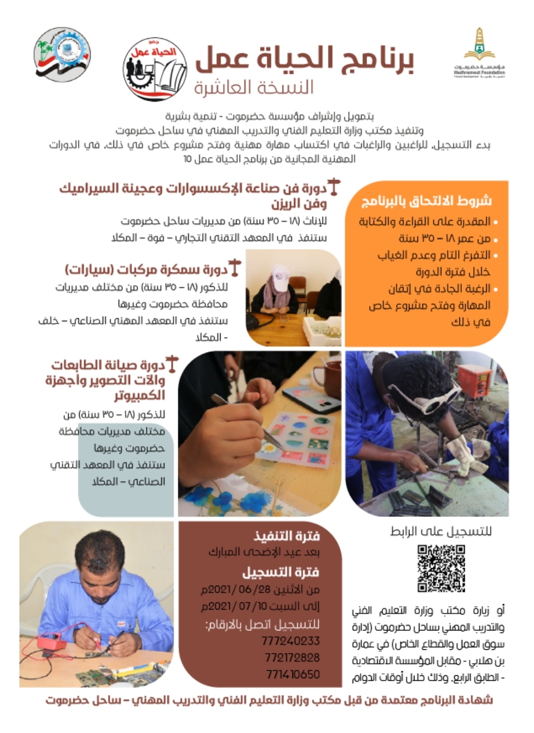 تعلن مؤسسة حضرموت – تنمية بشرية عن بدء التسجيل في الدورات المهنية المجانية من برنامج الحياة عمل 10: