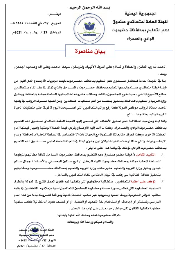 1- التأييد الكامل لأخوتنا معلمو صندوق دعم التعليم بمحافظ حضرموت الساحل لكافة مطالبهم المرفوعة