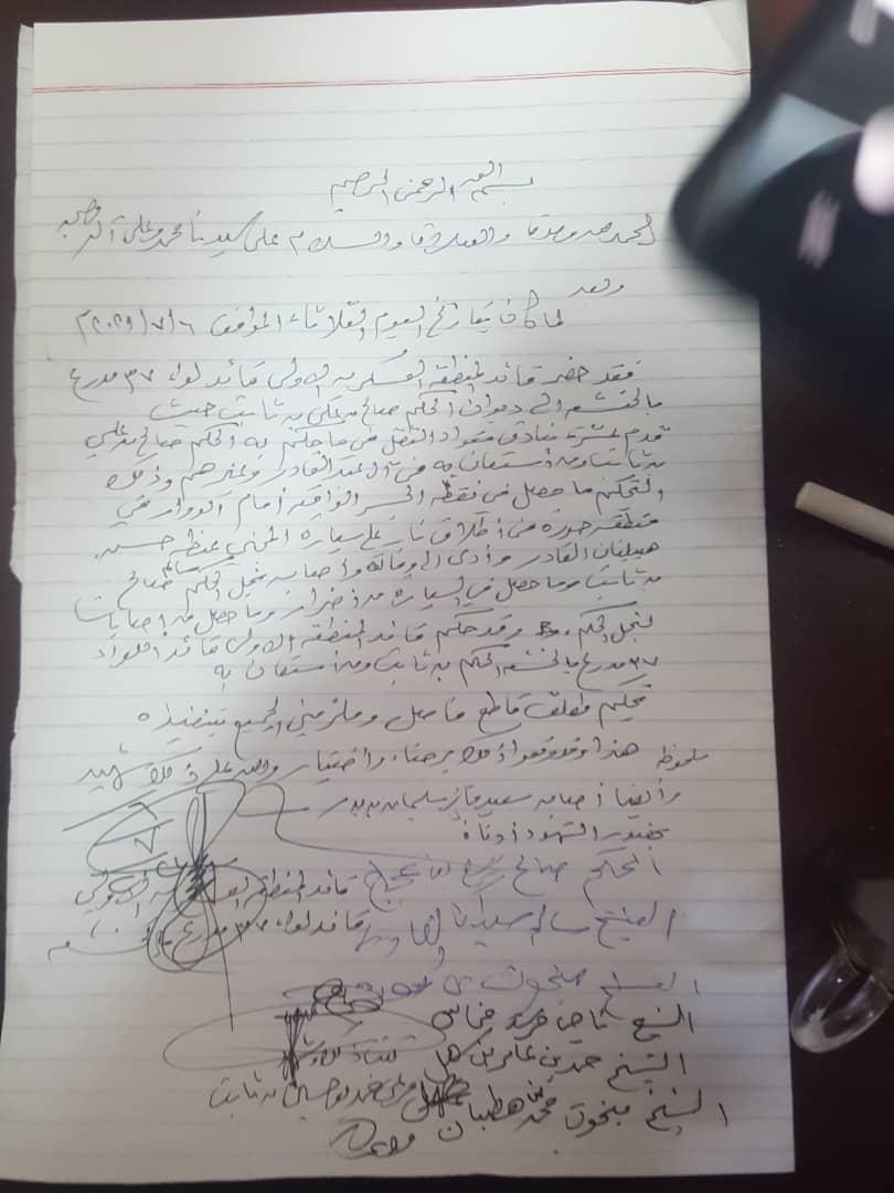 وقد حكّم قائد المنطقة الأولى قائد لواء 37 مدرع بالخشعة الحكم بن ثابت ومن استعان به تحكيم مطلق قاطع فاصل وملزم الجميع بتنفيذه وقبل الحكم صالح بن ثابت بذلك ووقع الجميع على ذلك برضا واختيار جميع الأطراف بحضور الشهود ووقعوا على ذلك..(مرفقة صورة وثيقة التحكيم)