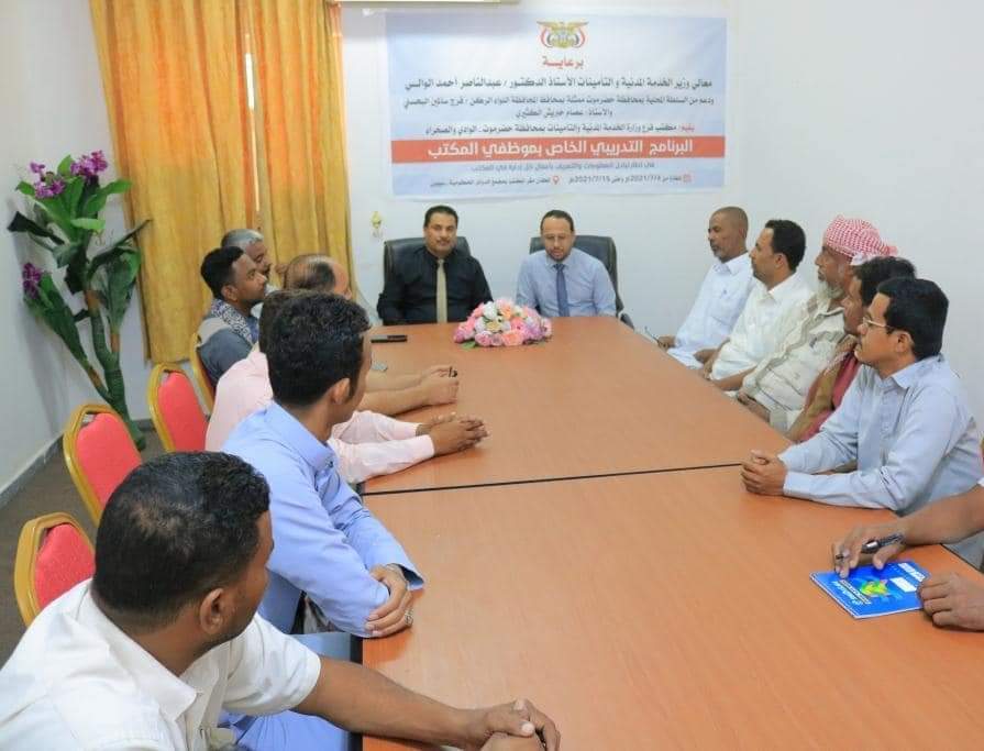 اختتم مكتب وزارة الخدمة المدنية والتأمينات بوادي حضرموت والصحراء، يوم أمس ، البرنامج التدريبي الخاص بموظفيه ، والذي جاء برعاية من وزير الخدمة المدنية والتأمينات ، وبدعم من السلطة المحلية بالمحافظة .