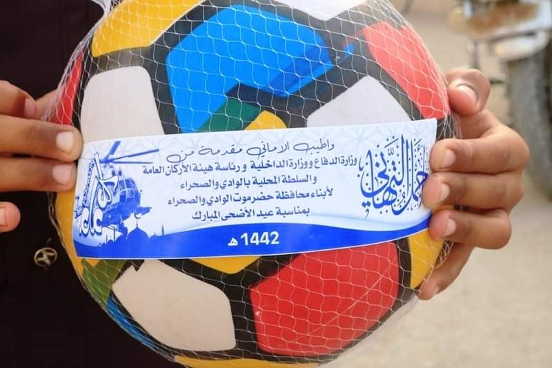 فيما احتوت بطاقة التهنئة المرفقة بتلك الهدايا العيدية ما يلي [ اجمل التهاني واطيب الاماني مقدمه من وزارة الدفاع ووزارة الداخلية ورئاسة هيئة الاركان العامة والسلطة المحلية بوادي حضرموت لأبناء محافظة حضرموت الوادي والصحراء بمناسبة عيد الاضحى المبارك 1442هـ .
