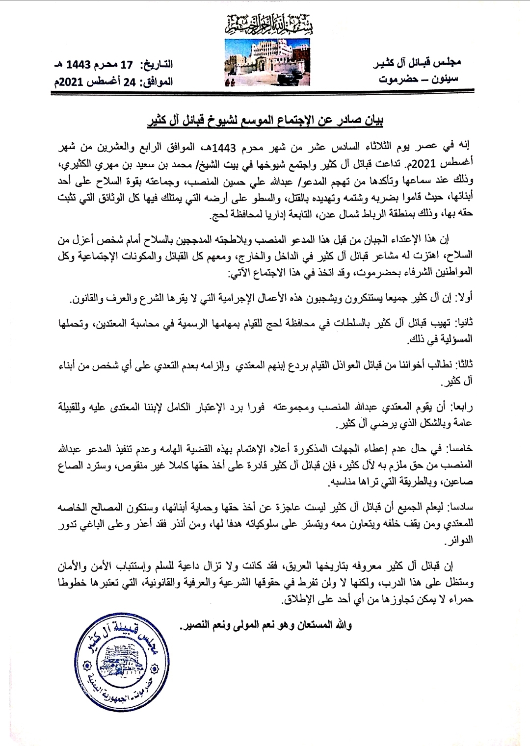 إنه في عصر يوم الثلاثاء السادس عشر من شهر محرم 1443هـ الموافق الرابع والعشرين من شهر أغسطس 2021م. تداعت قبائل آل كثير واجتمع شيوخها في بيت الشيخ / محمد بن سعيد بن مهري الكثيري وذلك عند سماعها وتأكدها من تهجم المدعو عبدالله علي حسين المنصب، وجماعته بقوة السلاح على أحد أبنائها، حيث قاموا بضربه وشتمه وتهديده بالقتل، والسطو على ارضه التي يمتلك فيها كل الوثائق التي تثبت حقه بها، وذلك بمنطقة الرباط شمال عدن، التابعة إداريا لمحافظة لحج.