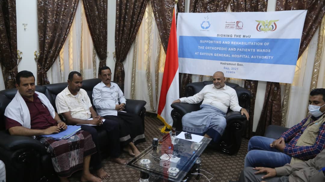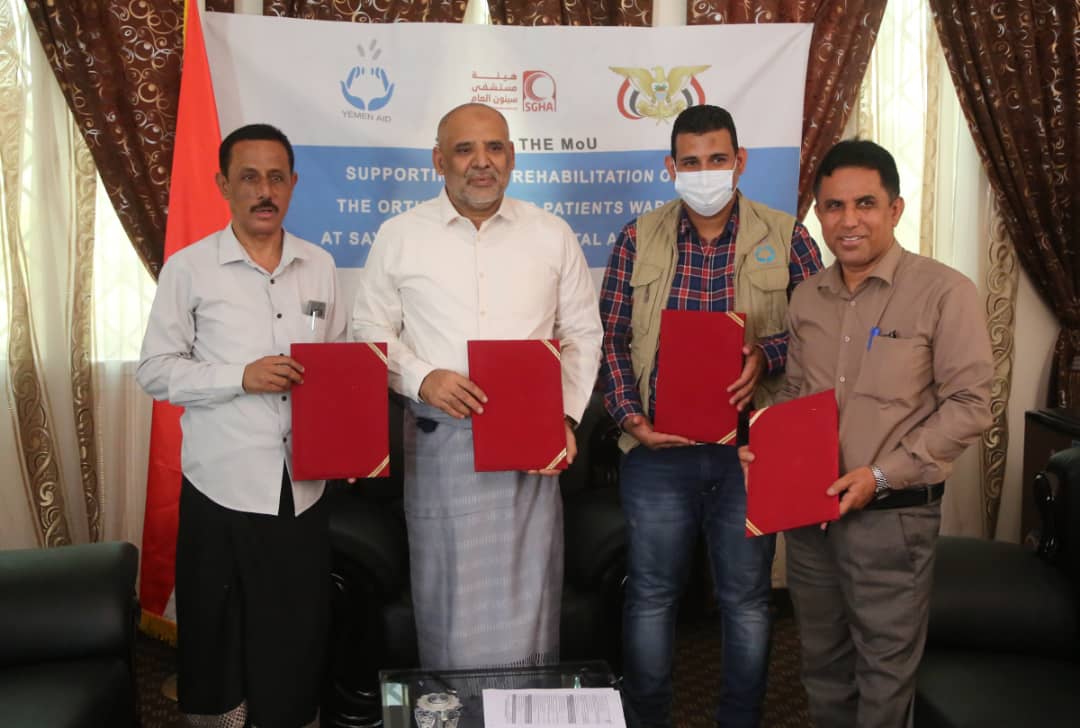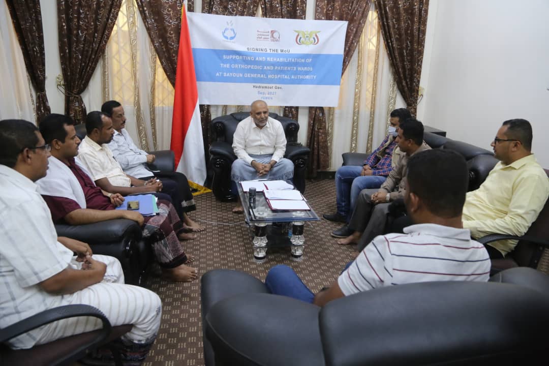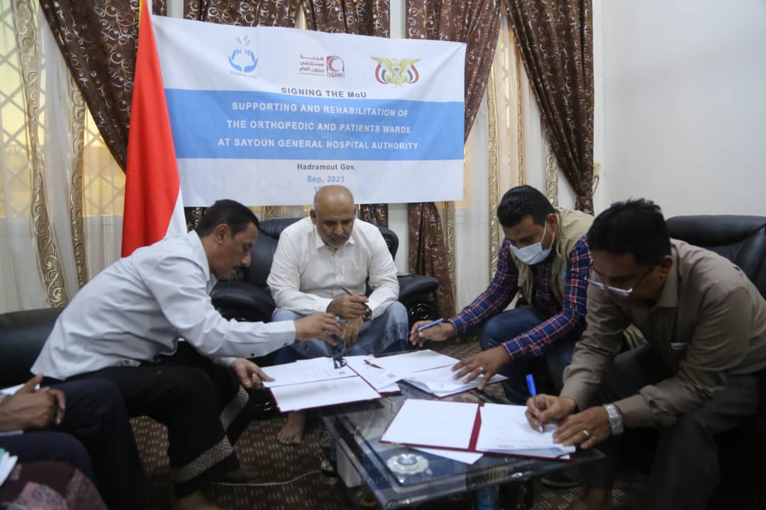 التوقيع على إتفاقية شراكة لدعم وتأهيل قسمي العظام ورقود الرجال بهيئة مستشفى سيئون بوادي حضرموت.