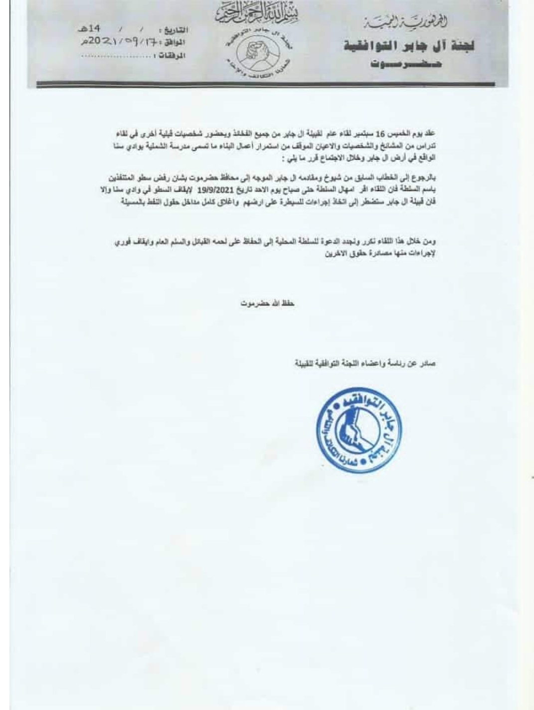 لجنة قبيلة آل جابر التوافقية تنشر بيان بخصوص السطو على أراضيها في وادي سنا من قبل بعض المتنفذين