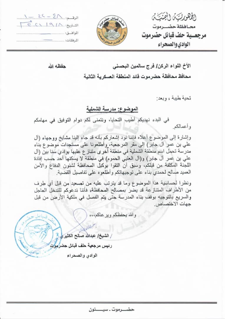 مرجعية قبائل حضرموت تطالب محافظ محافظة حضرموت بإيقاف بناء المدرسة محل النزاع القبلي بوادي سنا من أجل نزع فتيل الفتنة