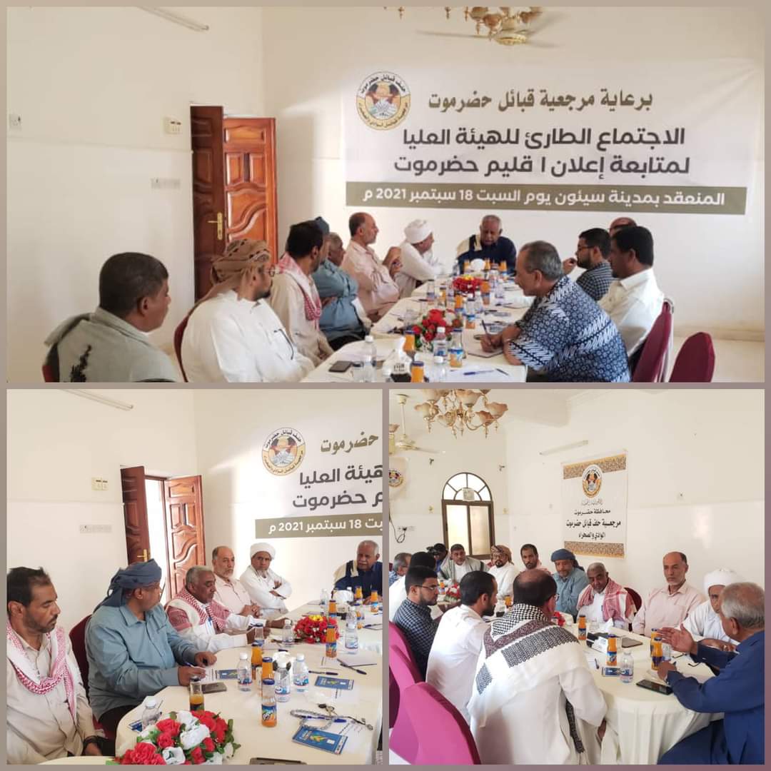 برعاية من مرجعية قبائل حضرموت عقد بمدينة سيئون صباح اليوم السبت الموافق 18 سبتمبر 2021م اجتماعا ضم عددا من النخب السياسية والمجتمعية من أعضاء الهيئة العليا لإعلان إقليم حضرموت ، حيث أقر المجتمعون في مستهل اللقاء التوافق على قيادة جديدة للهيئة برئاسة الأستاذ عبدالهادي عبداللاه التميمي بعد اعتذار الشيخ عبدالله صالح الكثيري في الاستمرار في هذه المهمة نظرا لانشغاله، كما أقر تكليف الأستاذ المساعد عبدالقادر حسين الكاف نائبا للرئيس، وتم الاتفاق على تعديل مسمى الهيئة إلى المسمى الجديد ( اللجنة التحضيرية للهيئة العليا لتفعيل إقليم حضرموت ) ، ليشمل كافة المحافظات الأربع للإقليم ( حضرموت _ المهرة _ شبوة _ سقطرى )، على أن يتم التنسيق والتواصل مع كافة المكونات والشخصيات الاجتماعية لتوحيد الموقف نحو تفعيل إقليم حضرموت..