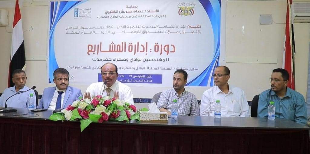 بدأت اليوم في مدينة سيئون محافظة حضرموت دورة تدريبية في مجال إدارة المشاريع للمهندسين بوادي حضرموت والصحراء ، التي تنظمها الإدارة العامة لبحوث التنمية الإدارية والتدريب بديوان وكيل المحافظة بالتعاون مع الصندوق الاجتماعي للتنمية فرع المكلا ، وبتمويل مشترك من السلطة المحلية بوادي حضرموت والصندوق الاجتماعي للتنمية.