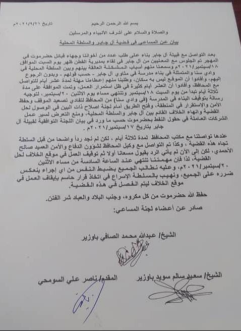 بيان من لجنة المساعي في قضية آل جابر والسلطة المحلية في محافظة حضرموت توضح فيه عدم تجاوب مكتب المحافظ معهم وانتهاء مهمتهم مساء الاثنين ٢٠ سبتمبر ٢٠٢١م