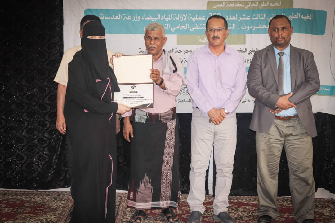 وبدوره قال الأستاذ أحمد محمد باعباد رئيس مؤسسة وصال للتنمية الجهة المنفذة للمخيم أن هذا المشروع يأتي في إطار الشراكة بين المؤسستين ومكتب وزارة الصحة العامة والسكان بحضرموت الساحل مؤكدا بأنه تم خلال المخيم معاينة قرابة 1200 حالة مرضية وإجراء لهم الفحوصات التشخيصية اللازمة منهم عدد 250 حالة تم إجراء لهم عمليات جراحية في مجال ‘‘ إزالة المياة البيضاء ‘ زراعة عدسات ‘‘ تكللت جميعها بالنجاح.