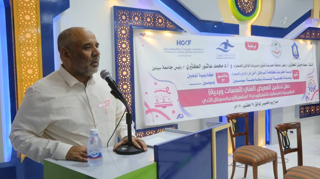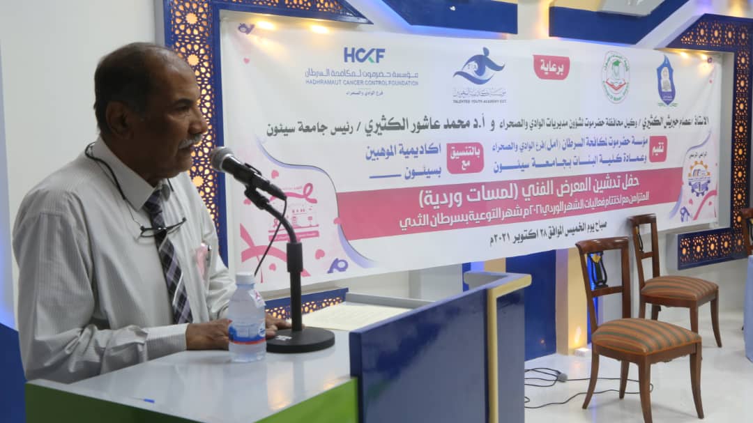 نظمت مؤسسة حضرموت لمكافحة السرطان “أمل ” وعمادة كلية البنات بجامعة سيئون بالتنسيق مع اكاديمية الموهوبين بسيئون حفل تدشين المعرض الفني (لمسات وردية ) المتزامن مع اختتام فعاليات الشهر الوردي اكتوبر ٢٠٢١ م شهر التوعية بسرطان الثدي .
