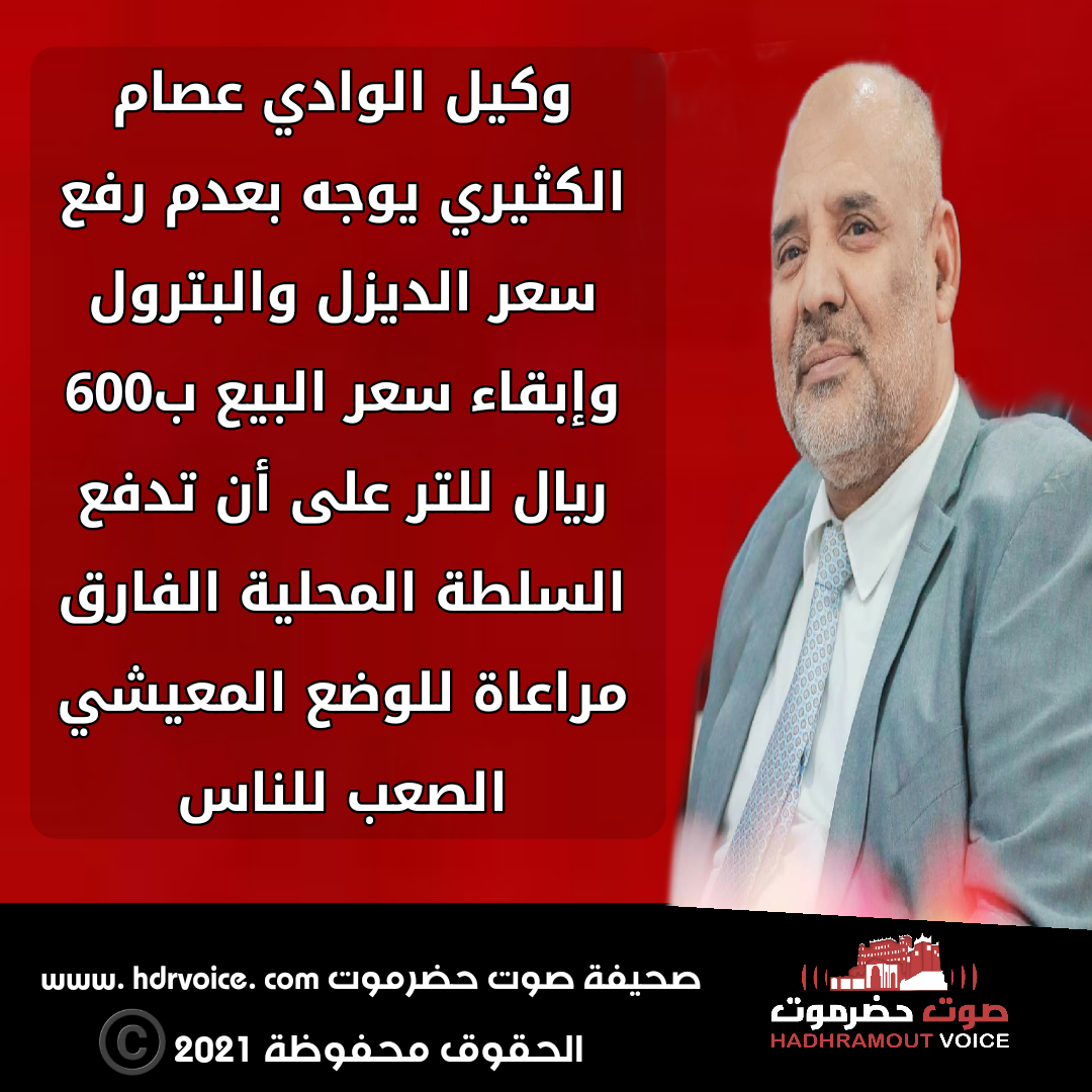 وكيل وادي حضرموت عصام الكثيري يوجّه شركة النفط بعدم رفع سعر الديزل والبترول وإبقاء سعر البيع بـ 600 ريال على أن تدفع السلطة المحلية بالوادي الفارق .