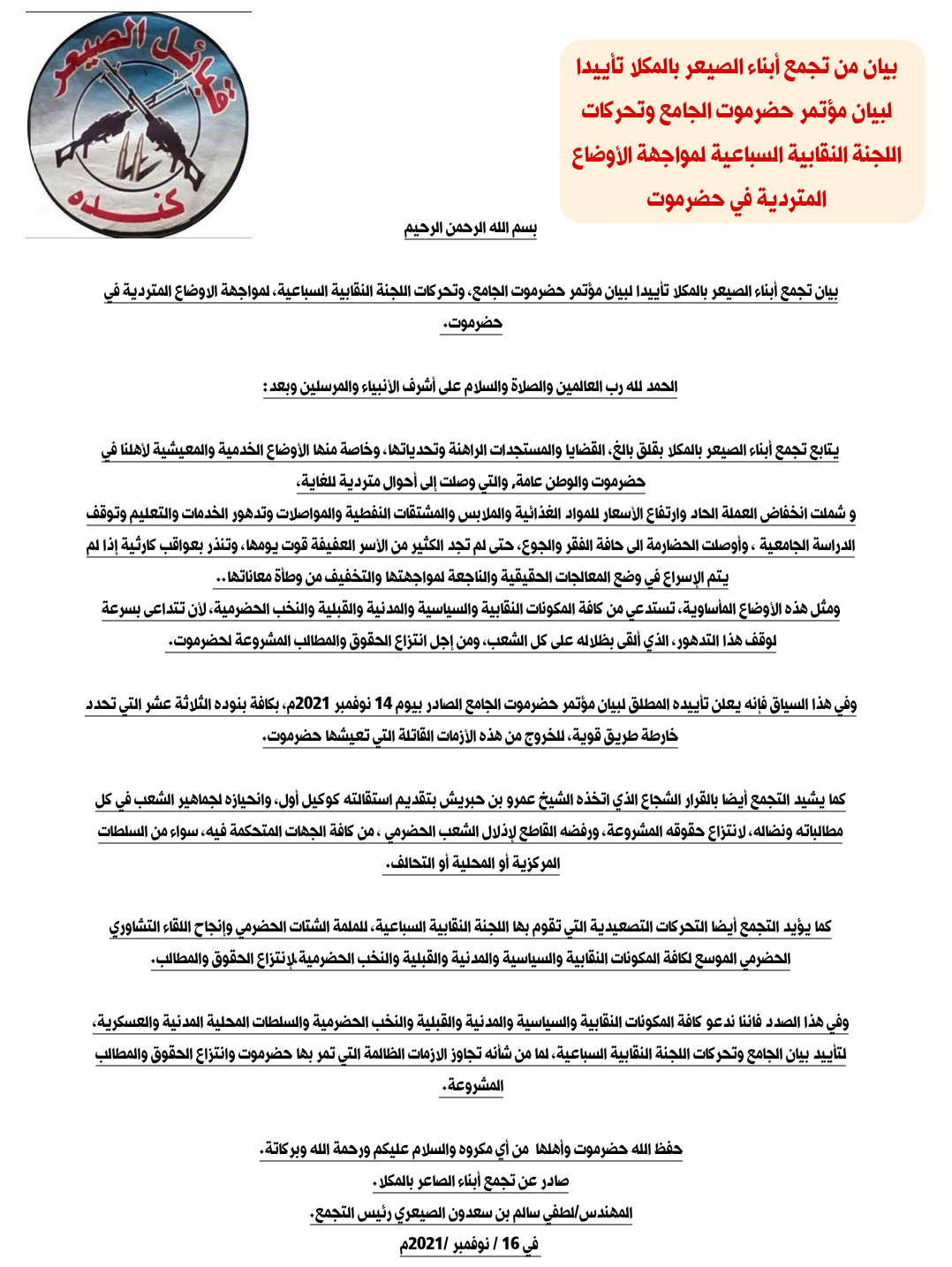 بيان من تجمع أبناء الصيعر بالمكلا تأييدا لبيان مؤتمر حضرموت الجامع وتحركات اللجنة النقابية السباعية لمواجهة الأوضاع المتردية في حضرموت