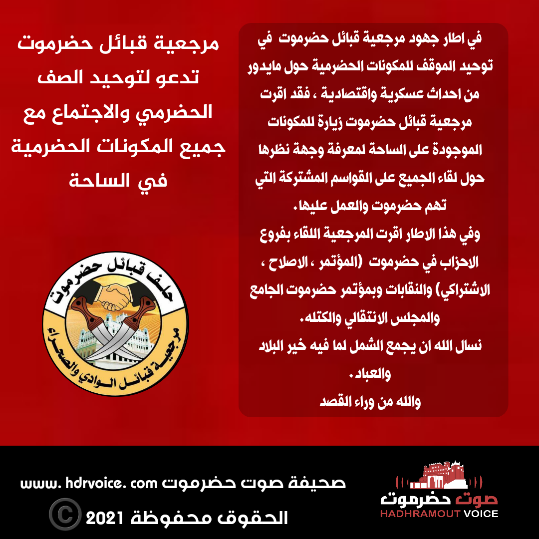مرجعية قبائل حضرموت تدعو لتوحيد الصف الحضرمي باجتماع مع كل المكونات الحضرمية على الساحة من فروع احزاب(موتمر ، اصلاح ،اشتراكي) والمؤتمر الجامع والمجلس الانتقالي والكتلة والنقابات والاجتماع على القواسم المشتركة بينهم.