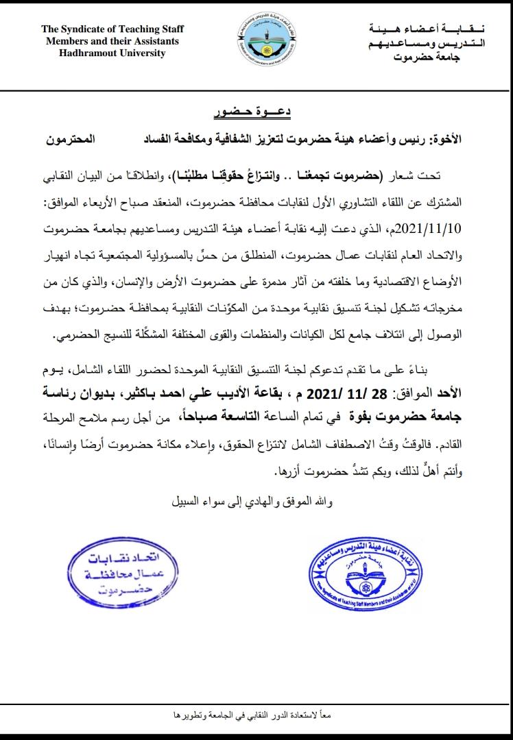 تستعد مكونات النسيج الحضرمي، التي تضم معظم التشكيلات النقابية والسياسية والمدنية والقبلية والنخب الحضرمية من مشايخ وأعيان ومثقفين وكذا الشباب والمرأة ، لعقد لقاءهم التشاوري الموسع ، بيوم *”الأحد ٢٨نوفمبر ٢٠٢١م الساعة التاسعة صباحا في قاعة باكثير بجامعة حضرموت .”* ويأتي هذا اللقاء تتويجا لسلسلة اللقاءات والمشاورات، التي تمت خلال الفترة الممتدة ، منذ انعقاد الإجتماع النقابي العام بيوم ١٠نوفمبر ٢٠٢١م ، وحتى الان ، والتي أجرتها قيادة السباعية النقابية، وعلى رأسها د.محمد الكسادي رئيس نقابة جامعة حضرموت ود.سالم باعارمة أمينها العام وقيادات أخرى من اتحاد نقابات عمال حضرموت، مع معظم المكونات والنخب التي تقود المجتمع الحضرمي، والبالغة أكثر من (٥٠)مكونا سياسيا ونقابيا ومدنيا وشبابيا ونسائيا ونخبويا،