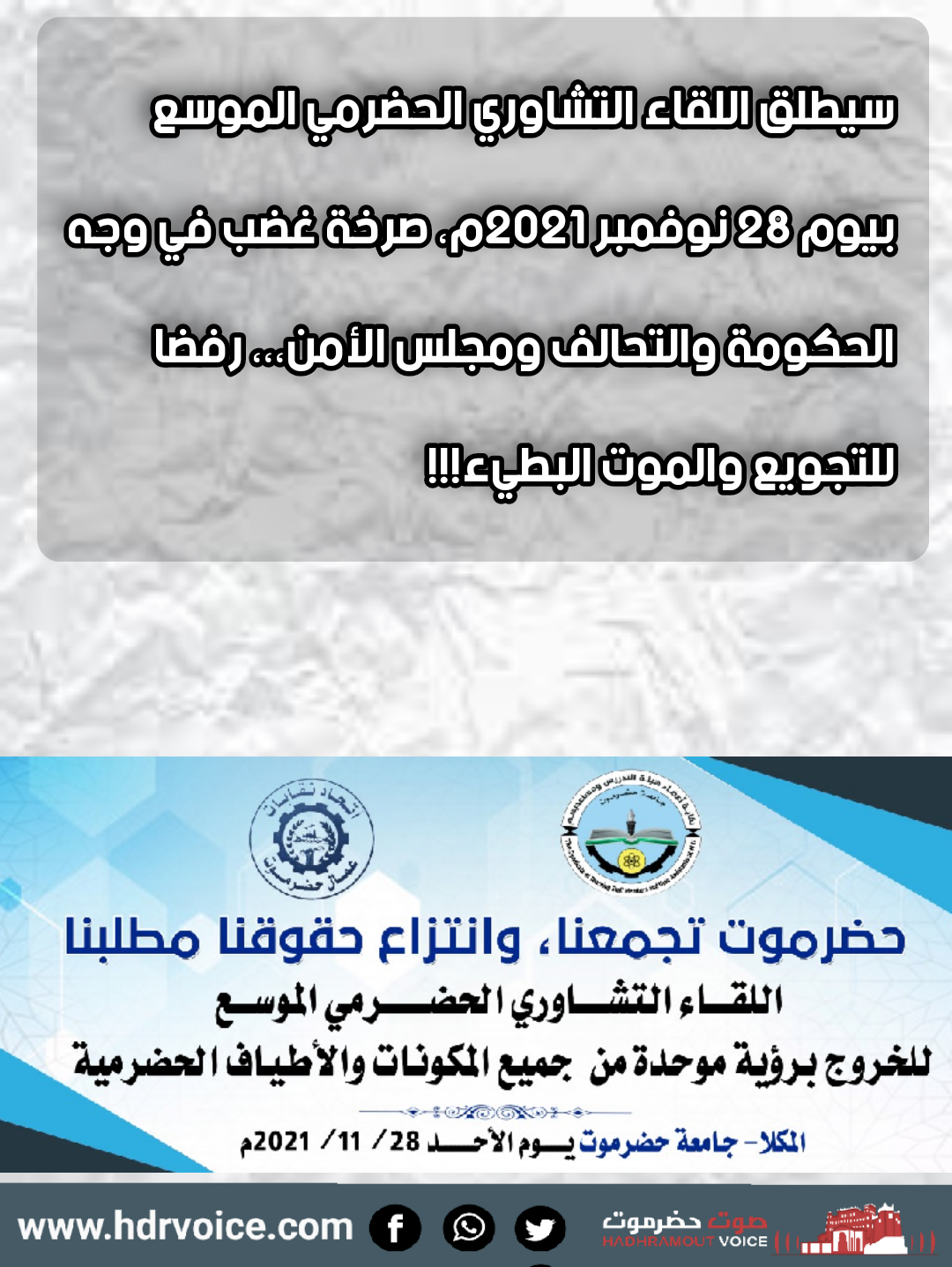 سيطلق اللقاء التشاوري الحضرمي الموسع بيوم ٢٨ نوفمبر ٢٠٢١م، صرخة غضب في وجه الحكومة والتحالف ومجلس الأمن،،، رفضا للتجويع والموت البطيء!!!