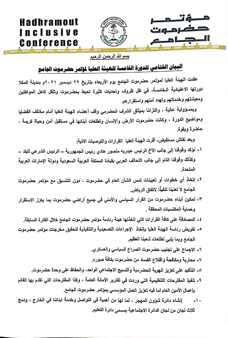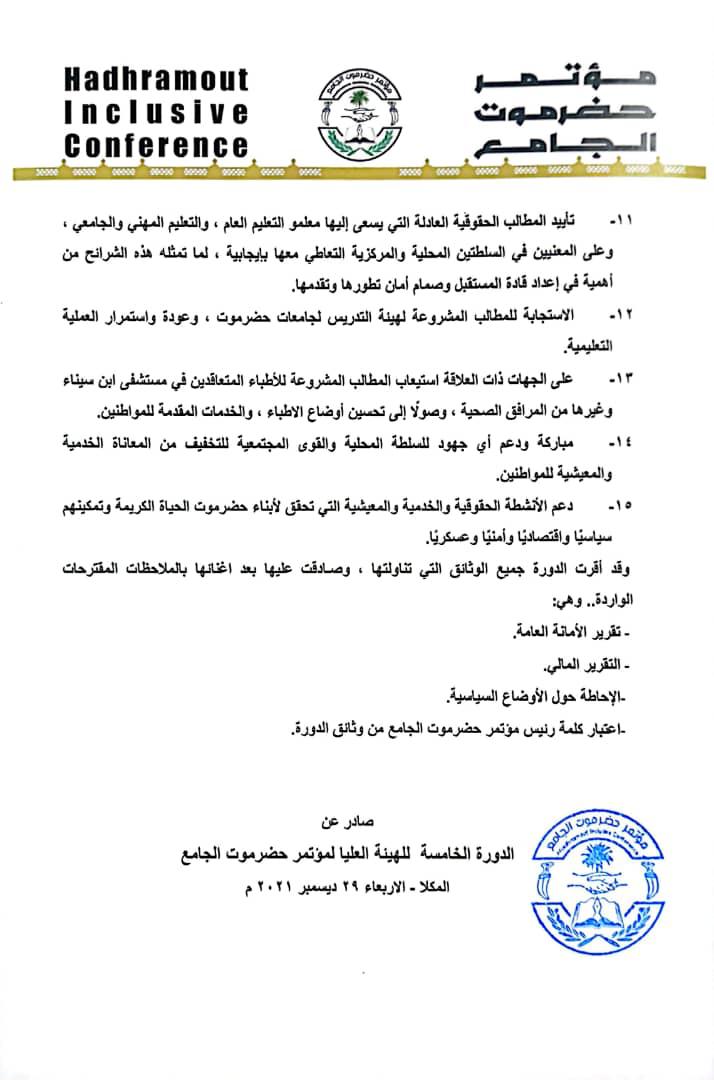 كما وقفت الدورة أمام التقرير المالي والقرارات التي اتخذتها هيئة رئاسة مؤتمر حضرموت واقرتها.