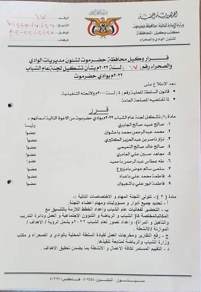 أصدر وكيل محافظة حضرموت لشؤون مديريات الوادي والصحراء عصام حبريش الكثيري قرارا رقم (17) لسنة 2022م ، قضت المادة الأولى منه بتشكيل لجنة عام الشباب 2022م بوادي حضرموت برئاسة صالح عبيد الجابري وعضوية 8 آخرين.