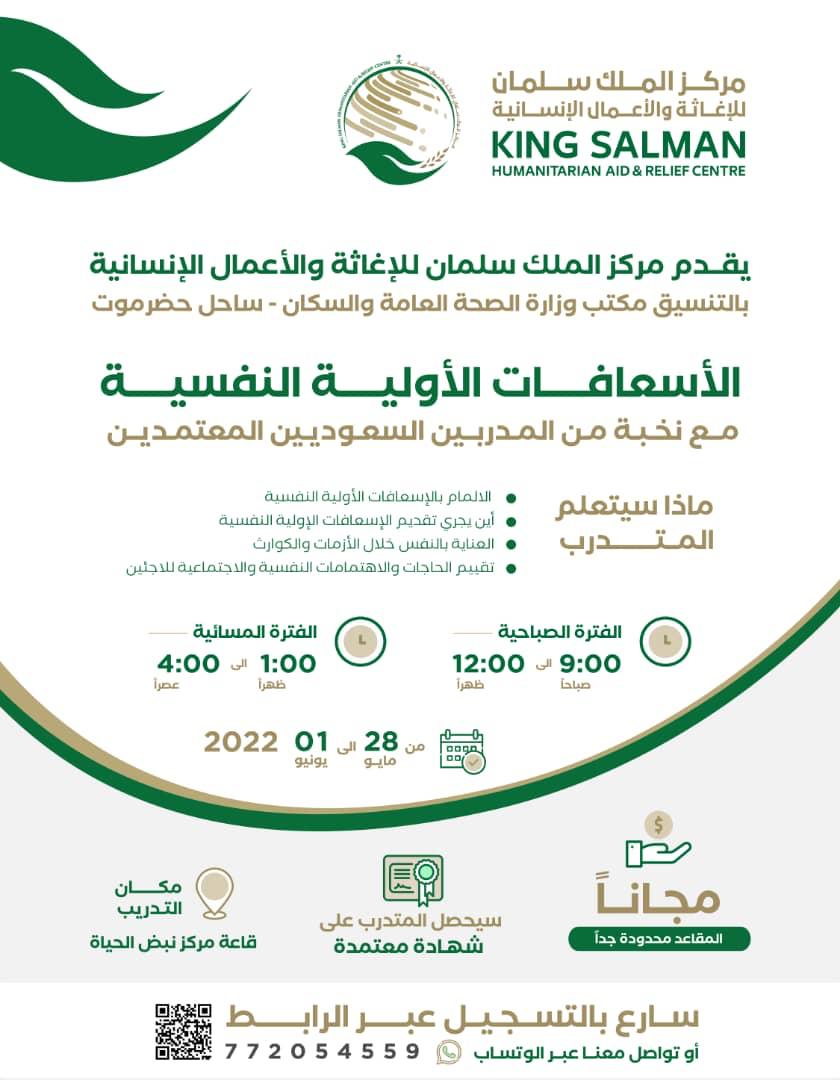 يقدم مركز الملك سلمان للإغاثة والاعمال الانسانية -بالتنسيق مع مكتب وزارة الصحة العامة والسكان-ساحل حضرموت – برنامجي الاسعافات الأولية النفسية وبرنامج سفير الحياة للإسعافات الأولية مع نخبة من المدربين السعوديين المعتمدين