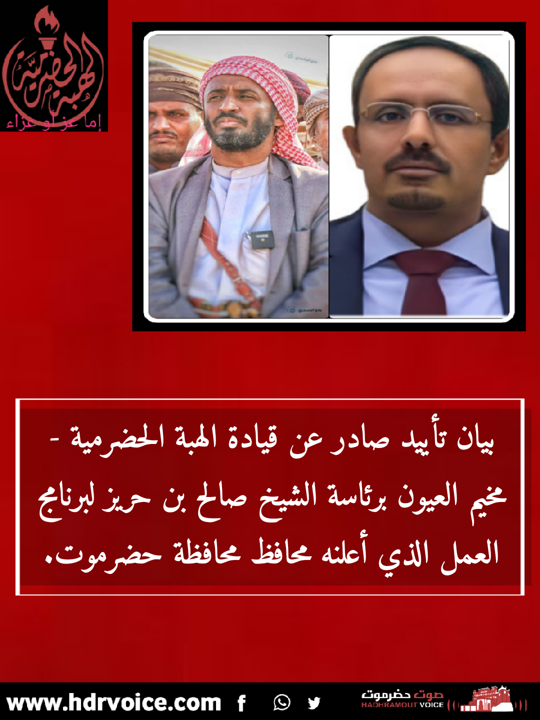 بيان تأييد صادر عن قيادة الهبة الحضرمية – مخيم العيون برئاسة الشيخ صالح بن حريز لبرنامج العمل الذي أعلنه محافظ محافظة حضرموت.