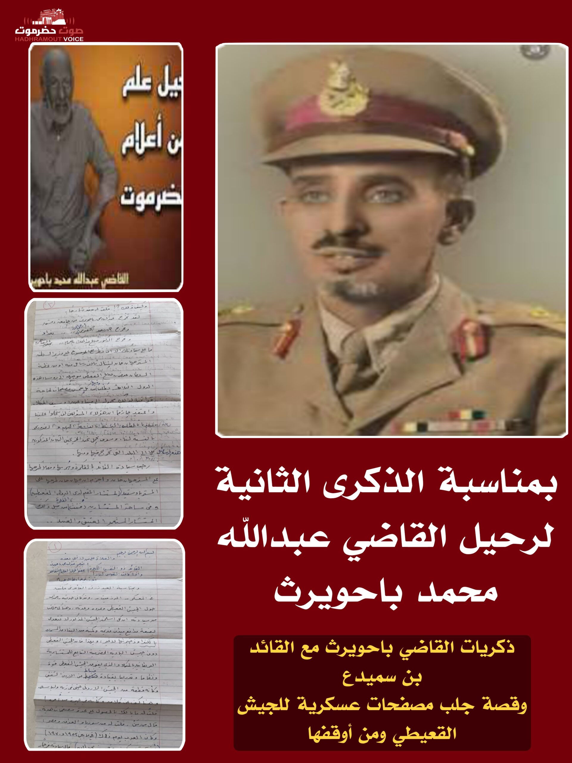 وكنت مواظب على زيارته بين الحين والآخر وبعد مرور سنة اتصل بي القاضي باحويرث وطلب حضوري لبيته واعطاني مقال كتبته عن ذكرياته مع القائد بن سميدع بخط يده .