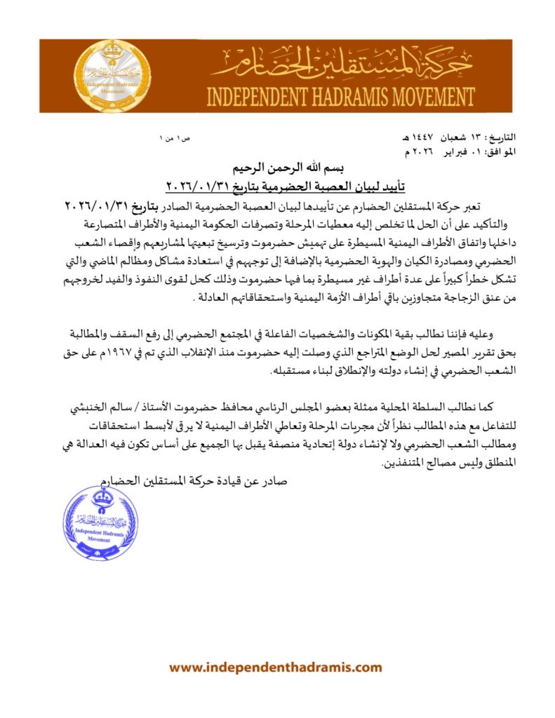 تعبّر حركة المستقلين الحضارم عن تأييدها لبيان العصبة الحضرمية الصادر بتاريخ 2026/01/31