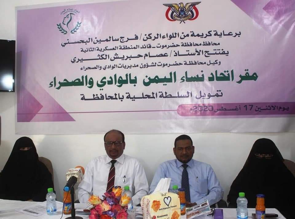 افتتح وكيل محافظة حضرموت المساعد لشؤون الوادي والصحراء عبدالهادي عبداللاه التميمي اليوم المبنى الجديد لاتحاد نساء اليمن بوادي حضرموت والصحراء بمدينة سيئون بكلفة إجمالية لمشروع المبنى بلغت 60 مليون و 171 ألف و570 ريال ممولة من السلطة المحلية بالمحافظة ، و ألفين و762 دولار تكلفة الأثاث مقدمة من السلطة المحلية بالوادي والصحراء .