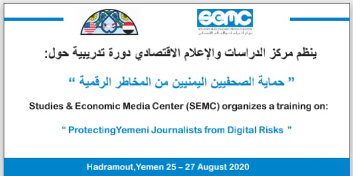 دشن مركز الدراسات والإعلام الاقتصادي صباح اليوم الثلاثاء الموافق 25_ أغسطس _2020م دورة تدريبية حول “حماية الصحفيين اليمنيين من المخاطر الرقمية” بالشراكة مع الملحقية الإعلامية الثقافية في سفارة الولايات المتحده الإمريكية في اليمن
