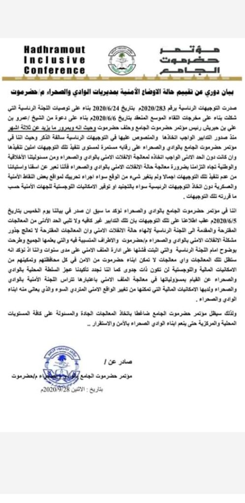 وأوضح البيان بأنه صدرت التوجيهات الرئاسية برقم 283/2020م بتاريخ 24/6/2020 بناء على توصيات اللجنة الرئاسية التي شكلت بناء على مخرجات اللقاء الموسع المنعقد بتاريخ 6/6/2020م بناء على دعوة من الشيخ /عمرو بن علي بن حبريش رئيس مؤتمر حضرموت الجامع وحلف حضرموت، وحيث أنه وبمرور ما يزيد عن ثلاثة أشهر منذ صدور التدابير الواجب اتخاذها والمنصوص عليها في التوجيهات الرئاسية سالفة الذكر، وحيث أننا في مؤتمر حضرموت الجامع بالوادي والصحراء على رقابة مستمرة لمستوى تنفيذ تلك التوجيهات آملين تنفيذها وإن كانت دون الحد الأدنى الواجب اتخاذه لمعالجة الانفلات الامني بالوادي والصحراء، ومن مسئوليتنا الأخلاقية والوطنية تجاه التزامنا بضرورة معالجة حالة الانفلات الامني بالوادي والصحراء .