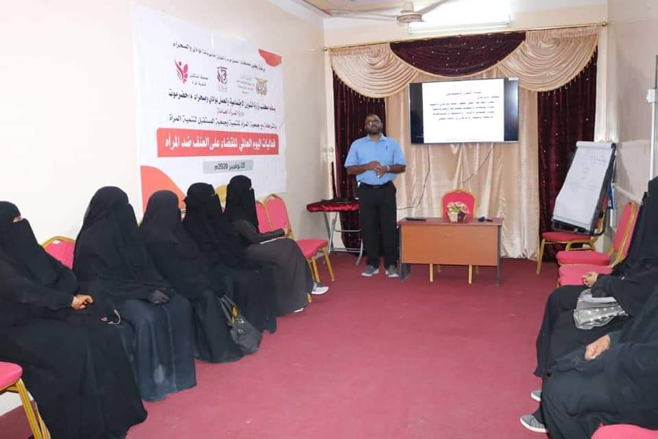 نظّم مكتب وزارة الشؤون الاجتماعية والعمل بوادي وصحراء محافظة حضرموت ممثل بإدارة ان العاملة بالمكتب بالشراكة مع جمعية المرأة للتنمية بمديرية القطن دورة تدريبية حول حقوق المرأة والعنف القائم على النوع الاجتماعي ضمن فعاليات اليوم العالمي للقضاء على العنف ضد المرأة والذي يأتي تحت شعار ” لا للعنف ضد المرأة ” بمشاركة 15 متدربة .