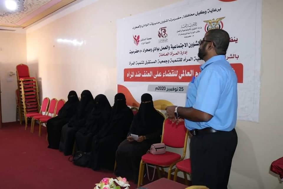 نظّم مكتب وزارة الشؤون الاجتماعية والعمل بوادي وصحراء محافظة حضرموت ممثل بإدارة ان العاملة بالمكتب بالشراكة مع جمعية المرأة للتنمية بمديرية القطن دورة تدريبية حول حقوق المرأة والعنف القائم على النوع الاجتماعي ضمن فعاليات اليوم العالمي للقضاء على العنف ضد المرأة والذي يأتي تحت شعار ” لا للعنف ضد المرأة ” بمشاركة 15 متدربة .