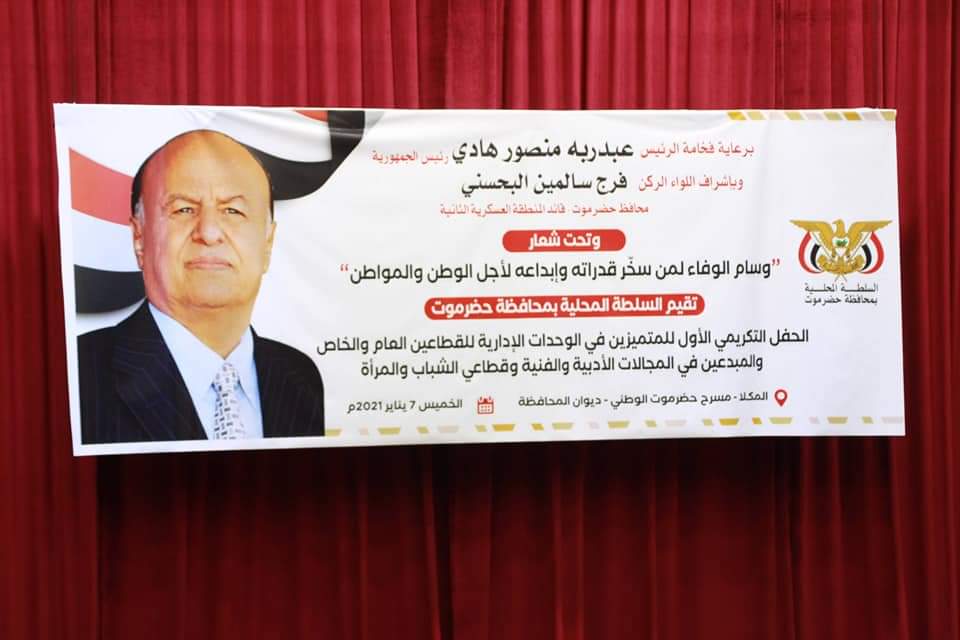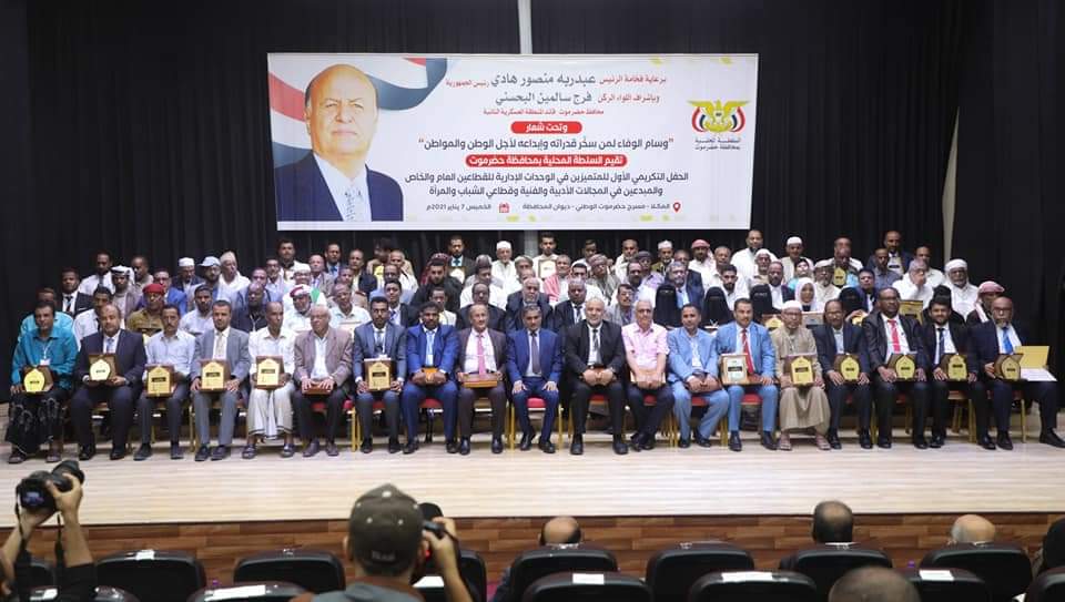 أقامت السلطة المحلية بمحافظة حضرموت، مساء اليوم بالمكلا، الحفل التكريمي الأول للمتميزين في الوحدات الإدارية للقطاعين العام والخاص والمبدعين في المجالات الأدبية والفنية وقطاعي الشباب والمرأة، برعاية فخامة الرئيس عبدربه منصور هادي رئيس الجمهورية، وإشراف محافظ المحافظة قائد المنطقة العسكرية الثانية اللواء الركن فرج سالمين البحسني.