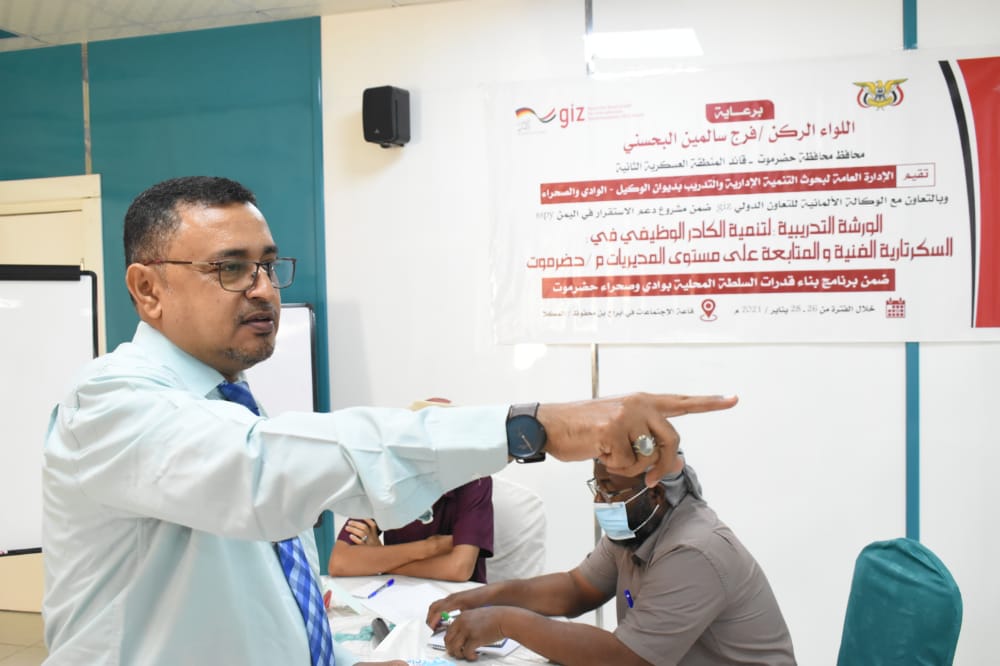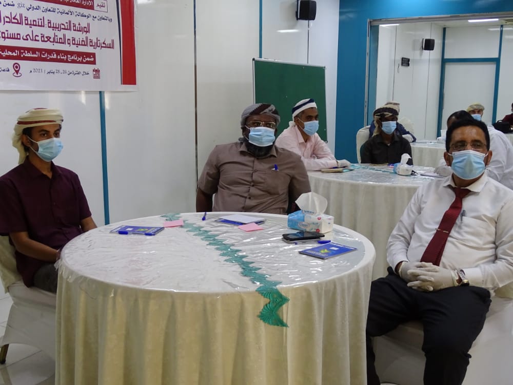 تدشين الورشة التدريبية لتنمية الكادر الوظيفي في السكرتارية الفنية على مستوى مديريات حضرموت الوادي والصحراء بتمويل من الوكالة الألمانية للتعاون الدولي (GIZ) بالمكلا
