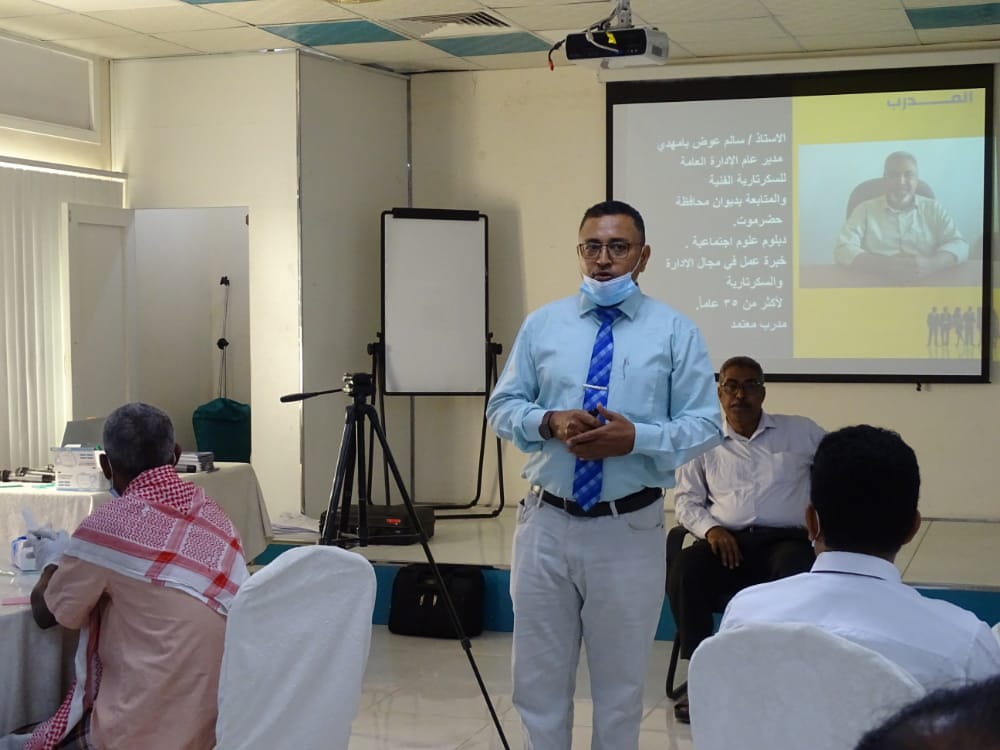 دُشّنت بقاعة أبراج بن محفوظ بمدينة المكلا فعاليات الورشة التدريبية لتنمية الكادر الوظيفي في السكرتارية الفنية والمتابعة على مستوى مديريات حضرموت الوادي والصحراء التي نظمتها الإدارة العامة لبحوث التنمية الإدارية والتدريب بديوان وكيل حضرموت لشئون مديريات الوادي والصحراء بالتعاون مع الوكالة الألمانية للتعاون الدولي (GIZ) ضمن مشروع دعم الاستقرار في اليمن برعاية كريمة من اللواء الركن فرج سالمين البحسني محافظ محافظة حضرموت قائد المنطقة العسكرية الثانية وبإشراف ومتابعة من الأستاذ عصام حبريش الكثيري وكيل المحافظة لشؤون مديريات الوادي و الصحراء،وضمن برنامج بناء قدرات السلطة المحلية بالوادي والصحراء لعام 2020- 2021م.